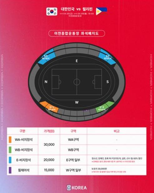 경기 티켓 가격은 서측(WA. WB) 3만원, 동측(E) 2만원이며 모두 비지정석입니다.
