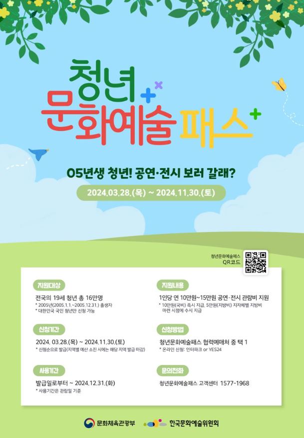 청년문화 예술패스란 2005년 출생한 19세 청년들을 대상으로 연 10~15만원 공연, 전시 관람비를 지원하는 제도입니다.