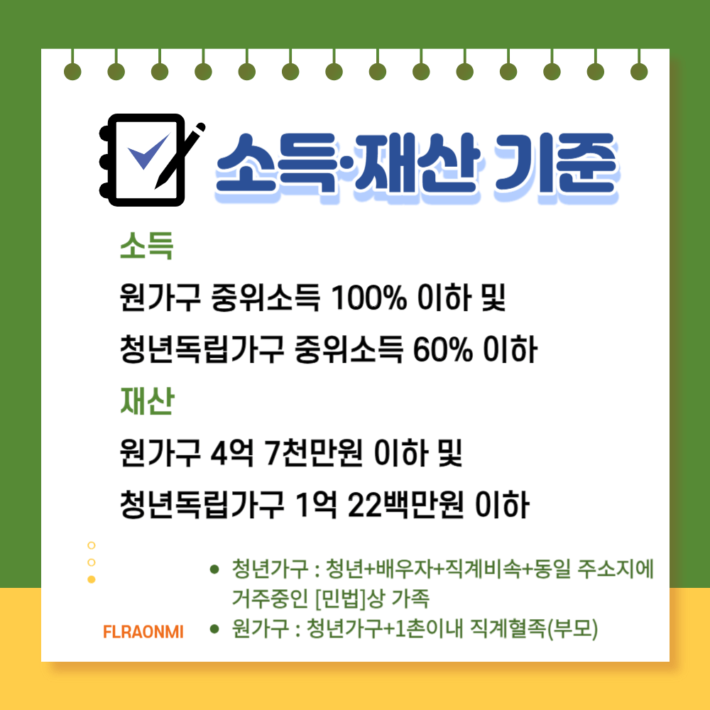 원가구 중위소득 뿐 아니라 청년 독립가구 기준 중위소득 60% 이하에 포함되어야 합니다.