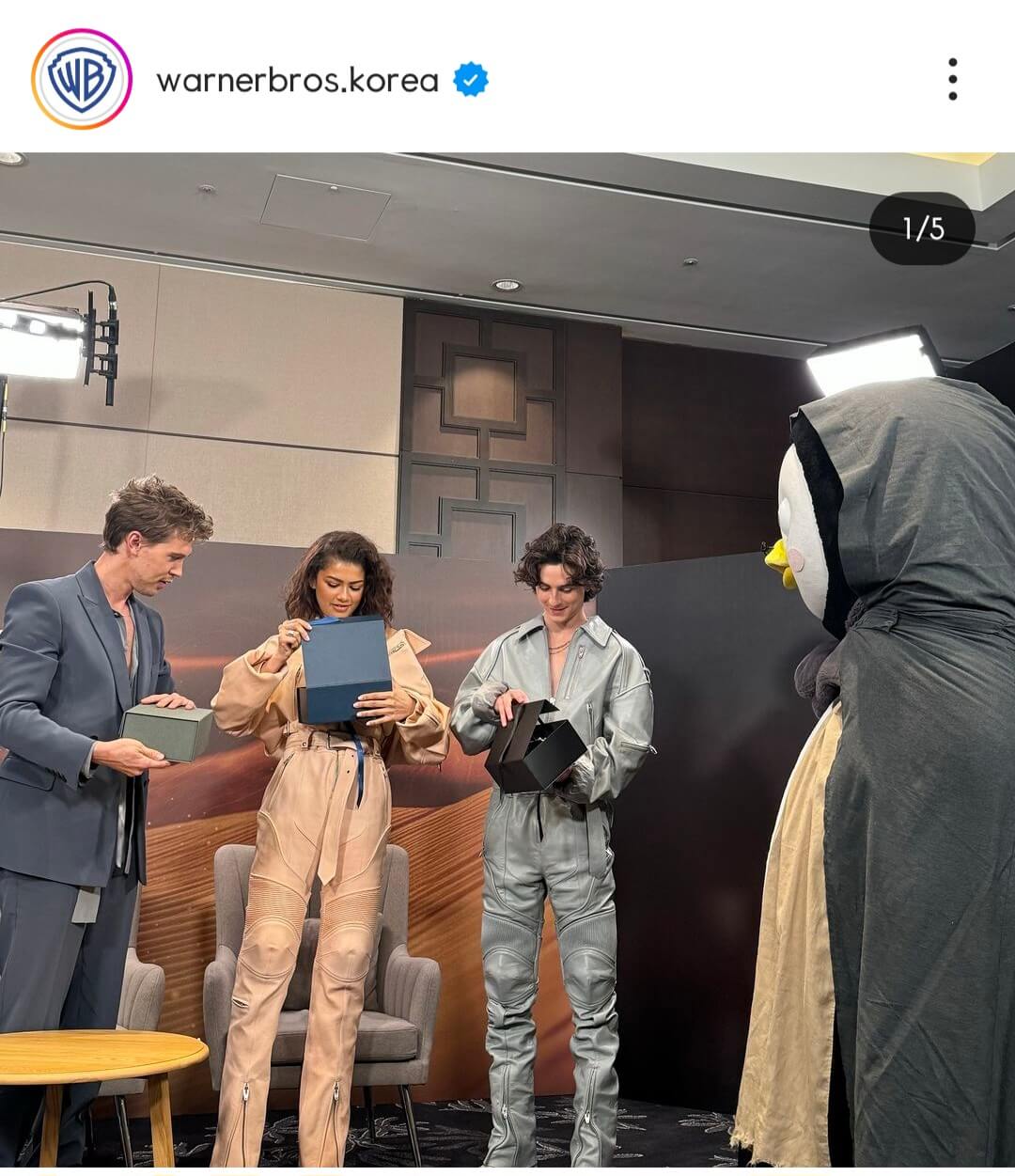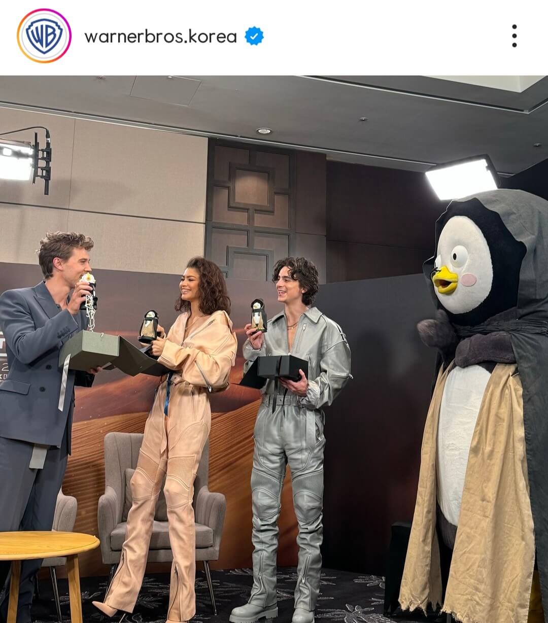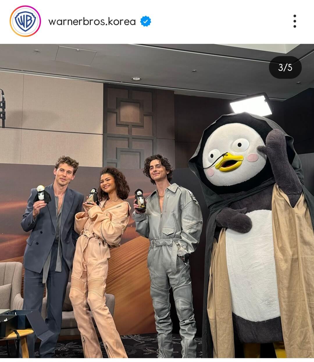 '티모시 샬라메'와 '젠데이아 콜먼'은 한국의 인기 캐릭터 '펭수'와도 만나서 화재가 되고 있습니다.