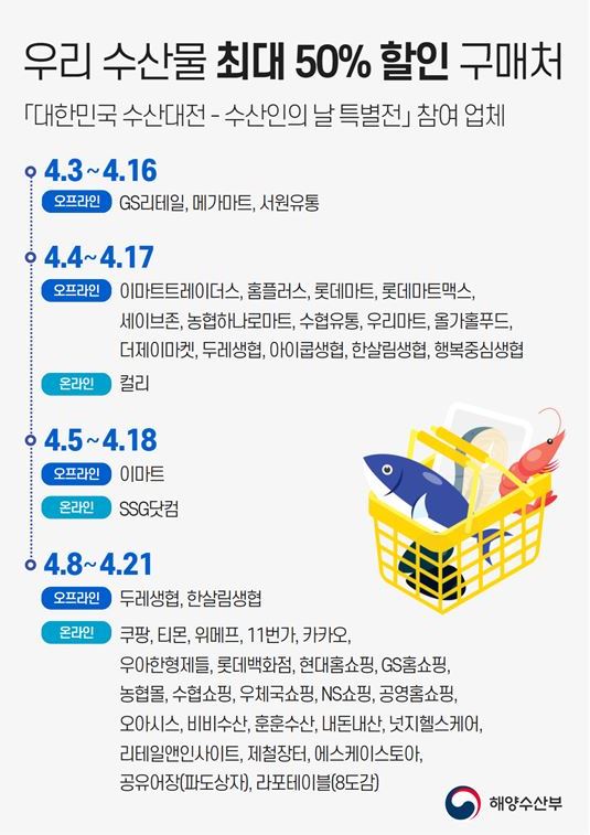 '수산인의 날 특별전'으로 진행하는 4월 수산대전 행사는 온/오프라인 구매처별로 행사 일정 차이가 있습니다.